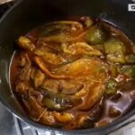 - Fry long cut Brinjal in smoked out Mustard Oil till golden and then strain out.